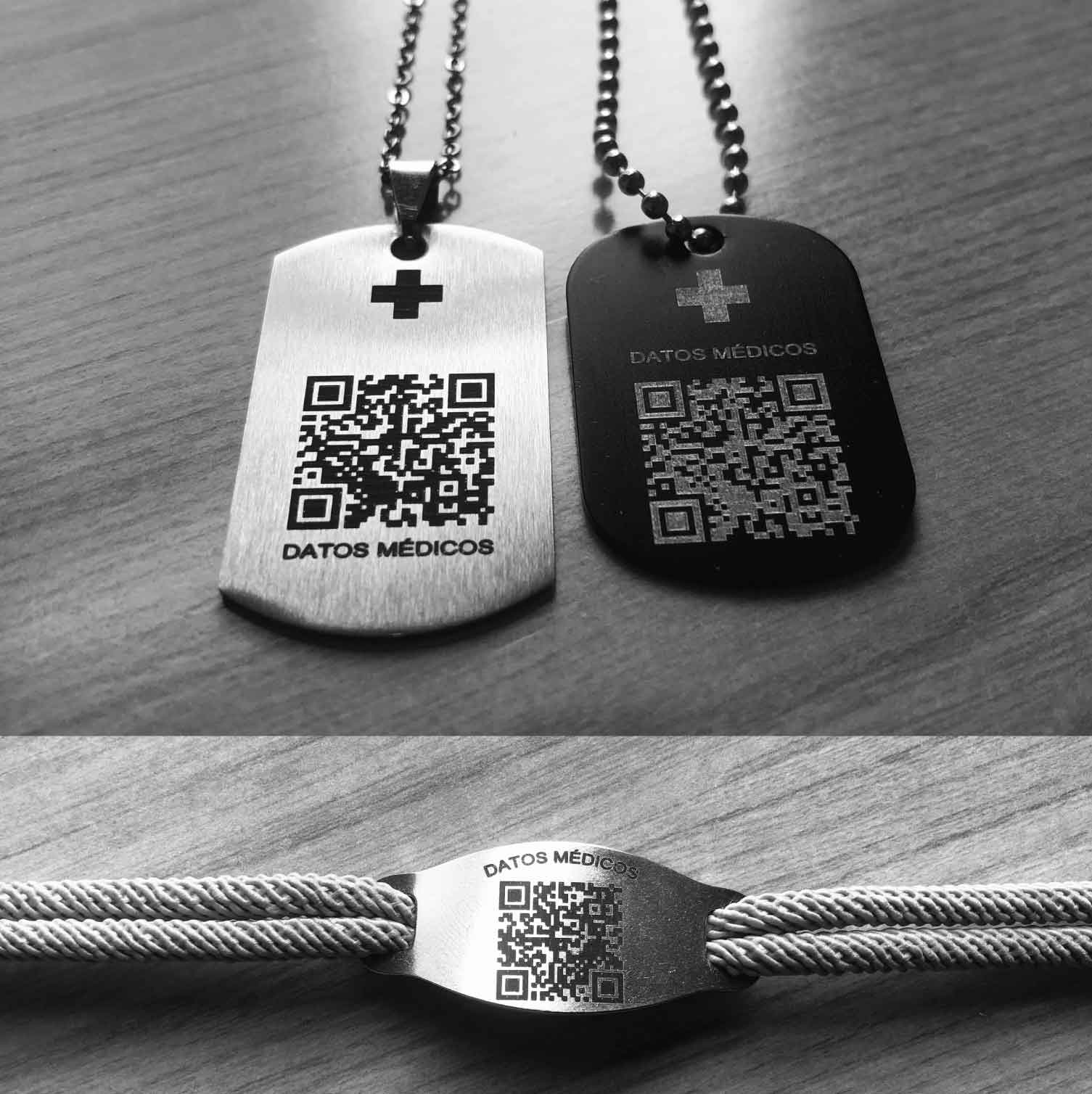 DATOS MÉDICOS PERSONALES CON CÓDIGO QR EN MEDALLAS Y PULSERAS.